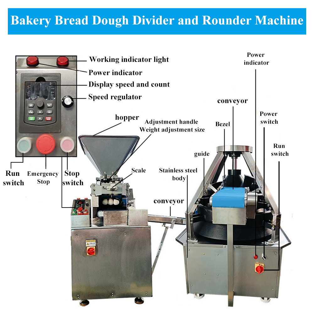 Divider range and capacity: 100-600g(1piece), 2000pcs/hr 50-250g(2pieces), 4000pcs/hr 30-100g(3pieces), 6000pcs/hr 15-60g(4pieces), 8000pcs/hr Power: 1.65kw Voltage: 220V/380V Dimension: 1060*1280*1480mm Weight: 420kg |